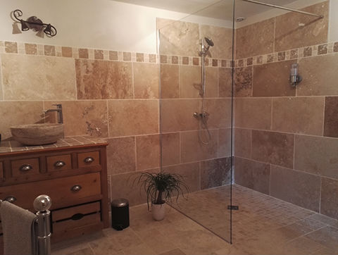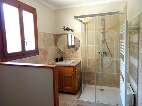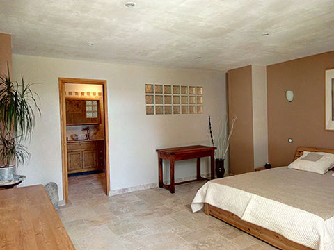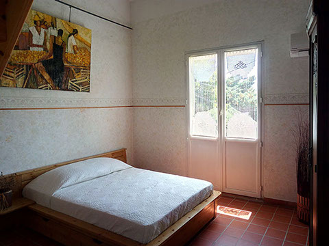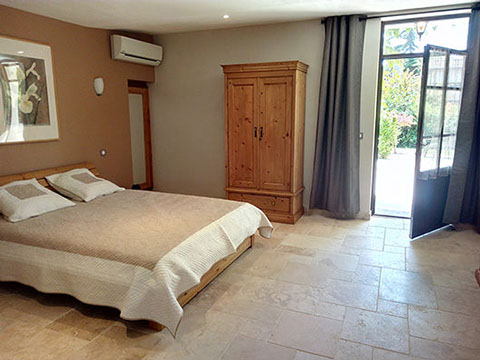 Petite chambre de 21m² tout confort (Climatisation, télévision, grande salle de bain avec douche à l'italienne) donnant sur la terrasse du jardin.