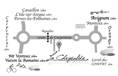 En plein coeur du Comtat Venaissin, à proximité de hauts lieux touristiques tels le Mont Ventoux, Vaison la Romaine, Avignon, Orange, les dentelles de Montmirail et bien d'autres encore, la Chrysalide vous accueille dans son cocon de douceur.